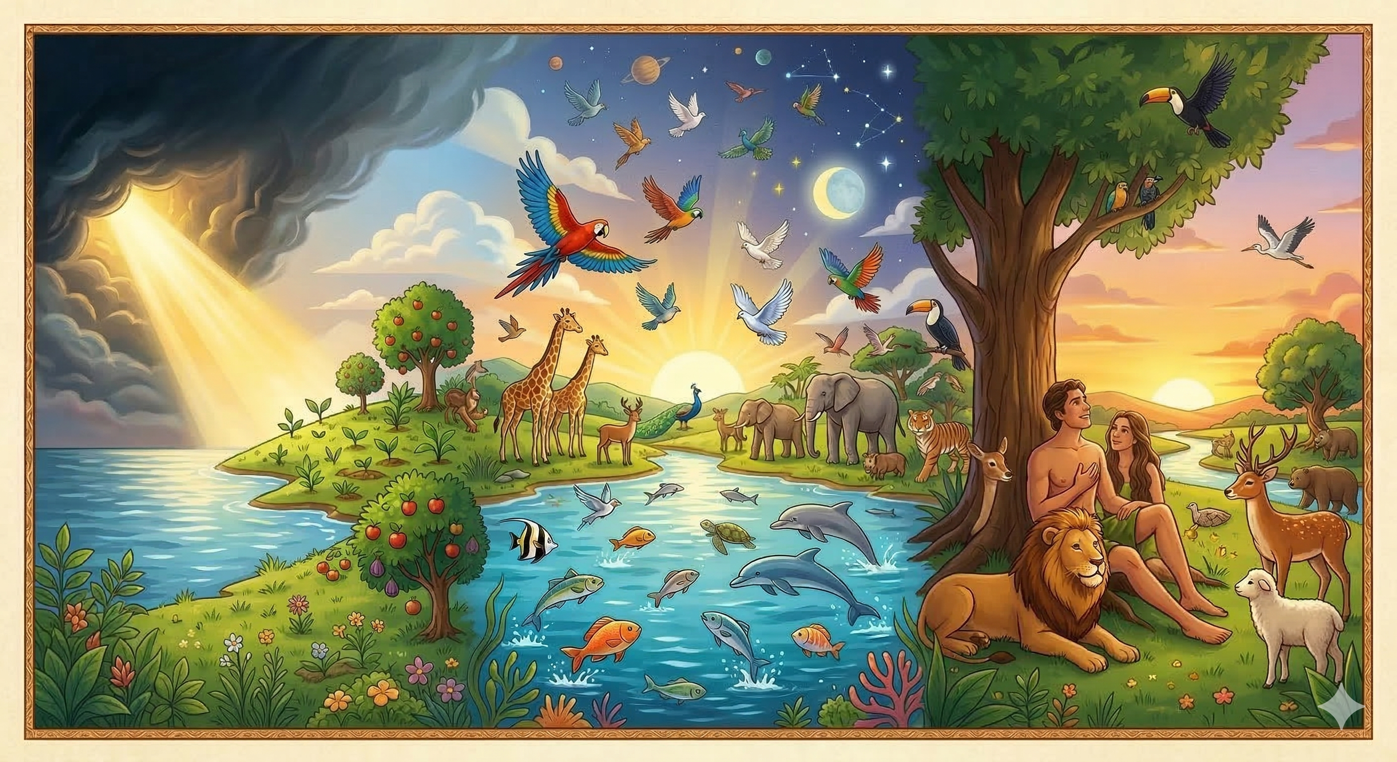上帝造完地上的動物後,做了最重要的一件事:祂用泥土、照著「自己的樣子」造了人,還對人的鼻孔吹了一口生氣。人變成了有靈魂、能思考、能愛上帝的特別寶貝。上帝還把管理全世界的權柄交給了人,因為我們是祂最信任的「小管家」。