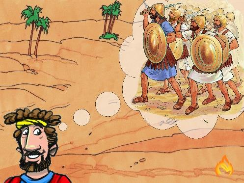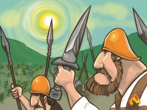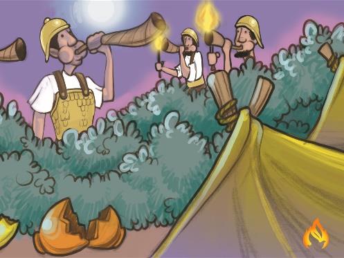 基甸將他的三百人分成三組,然後分發武器,你猜他們的武器是什麼?不是弓、箭和刀劍,而是每個人一支號角和一個空瓶,瓶内放了火把。由於當時夜深,米甸軍隊正在酣睡中,基甸與他的三百勇士悄悄地包圍敵軍。然後在基甸的吹號下,大家擊碎瓶子,登時火光熊熊。大伙兒右手持號角吹號,左手則舉著火把吶喊:「為耶和華和基甸殺敵!」