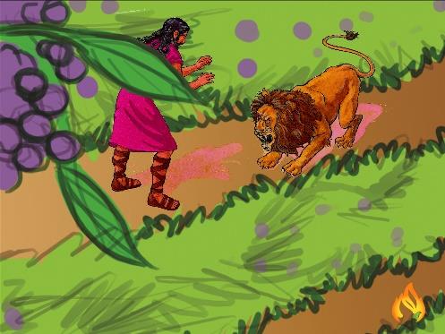 有一天,參孫要去看他的女友,途中經過葡萄園時遇到一隻獅子向他吼叫,神的靈臨到他身上,使他赤手空拳就將獅子撕裂並殺了牠。過了幾天,他又行經葡萄園,看到獅子的屍體裡,有一羣蜜蜂和蜂蜜,他便取其中的蜂蜜吃,違反拿細耳人的禁戒。