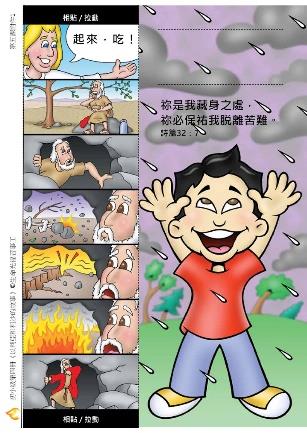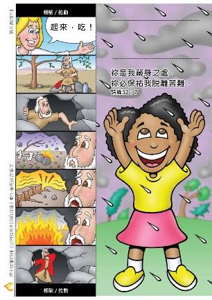 手工:手動影片 按男女學生分別影印附件1 或2,剪下男孩(女孩)和以利亞故事的長條,在男孩(女孩)圖中剪開虛線,將以利亞故事的長條穿過虛線,然後將長條黑色部份相貼。拉動長條便可重溫神怎樣幫助以利亞。