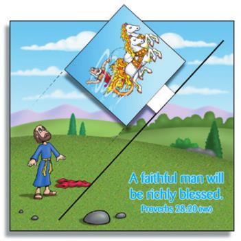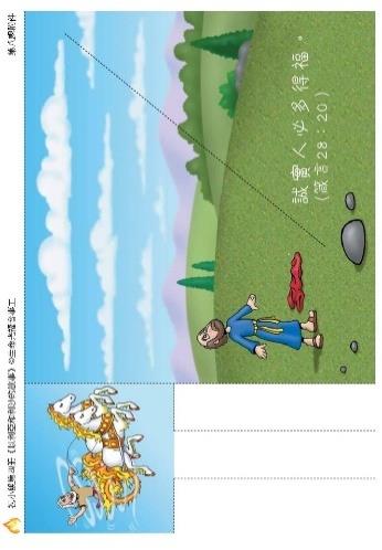 以利亞升天 請影印附件,指導學生沿虛線剪下圖片,將火車火馬的伸出部份插入大圖的虛線中,便能看到以利亞乘旋風升天了。