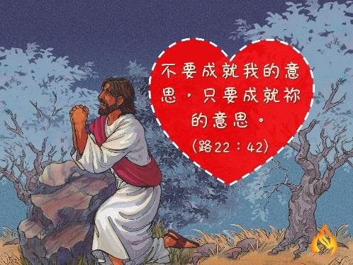 「主耶穌,謝謝祢在客西馬尼園為我做的決定。雖然祢很痛苦,但祢仍選擇順服天父。有時候我也想照自己的意思去做,不想聽話,求祢幫助我學習說:不要成就我的意思,只要成就祢的意思。讓我一生都行在祢的旨意中。奉耶穌的名禱告,阿們。」