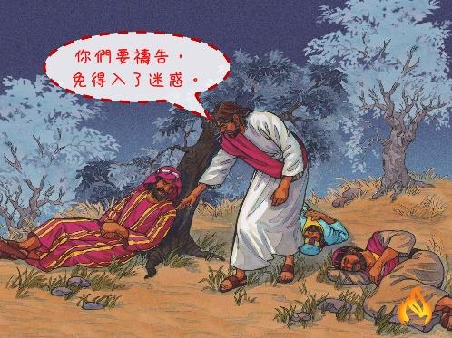 但是,耶穌的門徒都不明白禱告的重要性。耶穌要他們儆醒禱告,爲什麼?(請學生讀路22:40「你們要禱告,免得入了迷惑。」)祂要門徒以禱告抵抗誘惑。耶穌知道門徒將同祂一樣面臨大難,因爲祂快要被釘死。但是耶穌禱告完之後,回到門徒坐的地方,祂看到什麼?彼得、雅各和約翰都睡著了!耶穌對彼得説:「你爲什麼睡覺呢?你不能同我儆醒片時麼。總要儆醒禱告,免得入了迷惑,你們心靈固然願意,肉體卻軟弱了。」